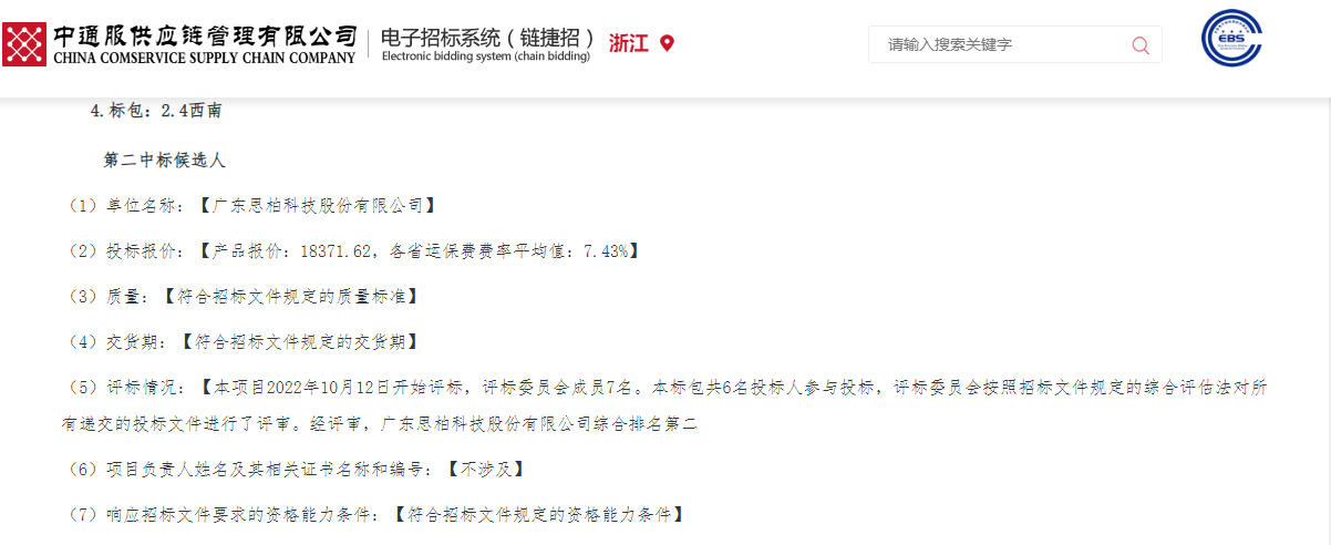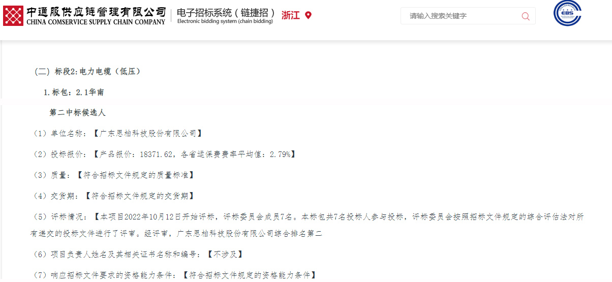 近日,浙江中通通信有限公司电子招标平台公示了《中国通信服务股份有限公司2022年第一批总部级工程材料集中采购项目(第二次)》的中标候选人。