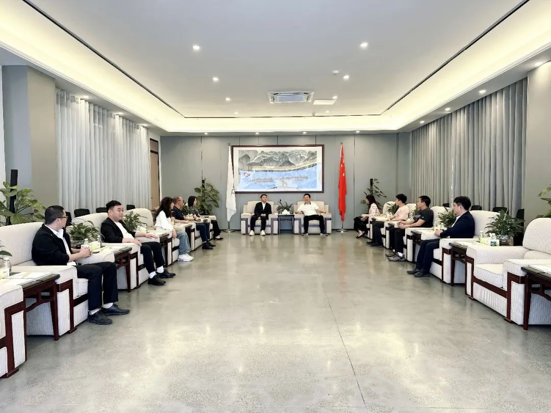 炭步商会各位来宾与陈总在会议室进行洽谈