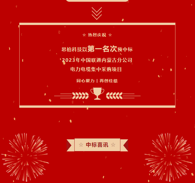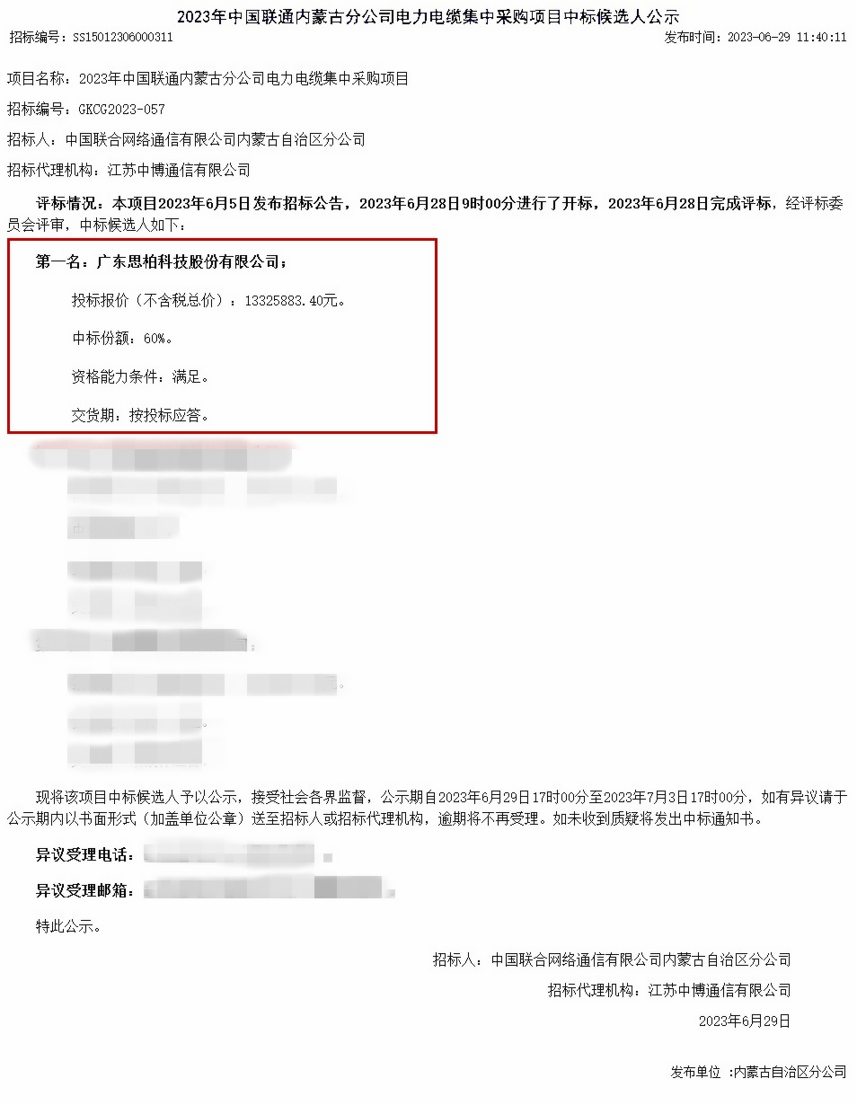 近日,中国联通采购与招标网公示了《2023年中国联通内蒙古分公司电力电缆集中采购项目》的中标候选人。
